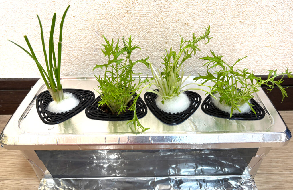 1棟めが、ネギ(陽性野菜)1部屋と、水菜(半陰性野菜)3部屋。水菜は結構光が強くても育ってくれてるから、この組み合わせは何とかいける♪