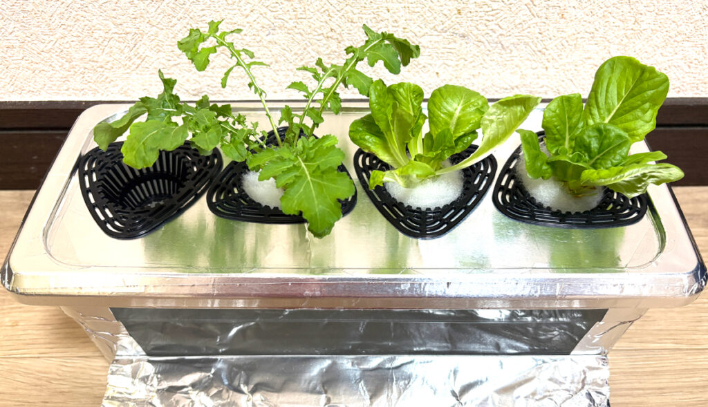 2棟めが、サラダ菜(半陰性野菜)2部屋と、ルッコラ(半陰性野菜)1部屋と、根が生えてきたクレソン(半陰性野菜)1部屋(予定)。半陰性野菜を集めたお互い丁度良い環境かな。