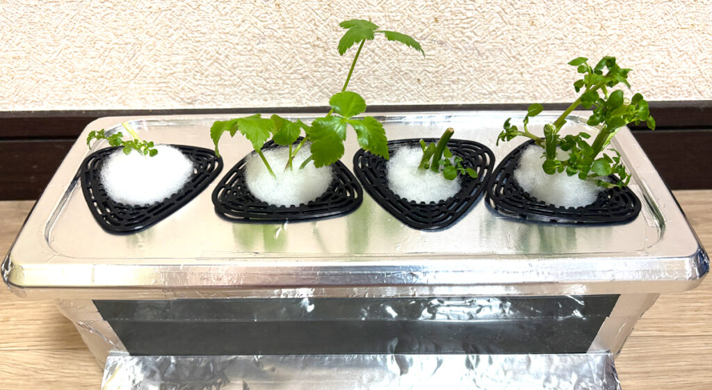3棟めが、クレソン(半陰性野菜)2部屋と、三つ葉(陰性野菜)1部屋と、せり(陰性野菜)1部屋。陰性野菜寄りの環境で育てるけど、クレソンにどう影響するか。