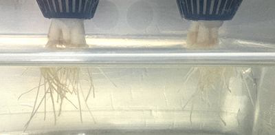水菜4株のうち、ひと枠が空いたので、水菜の容器にお引越し。なのでEC値は約1100。