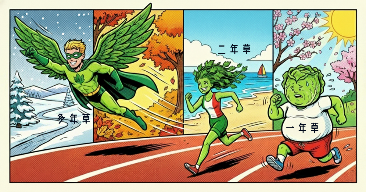 | 定義 | 1年目は葉っぱだけで過ごし、2年目に花を咲かせて枯れる植物 |